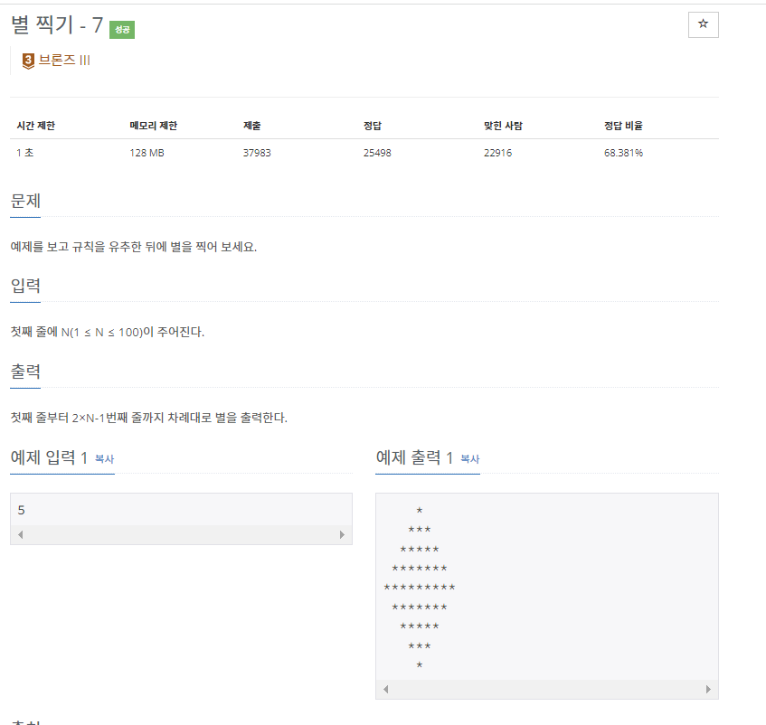 첫째 줄부터 2×N-1번째 줄까지 차례대로 별을 출력한다.