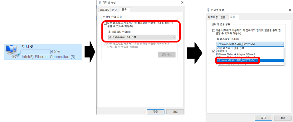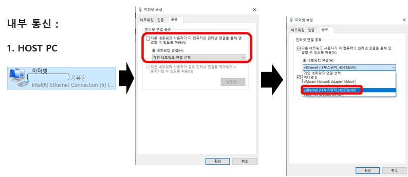 4.HOST PC의 이더넷의 공유==>생성된 내부 스위치 와의 공유를 클릭한다.
