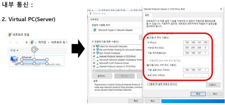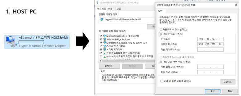 주소 IP: 네트워크 주소 대역 HostPC의 Vethernet IP대역과 동일하게 가야한다.