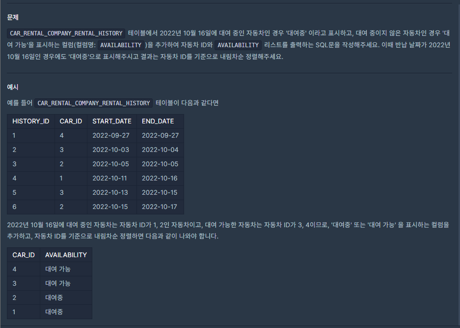 [프로그래머스 ORACLE SQL]자동차 대여 기록에서 대여중 / 대여 가능 여부 구분하기★CASE WHEN THEN