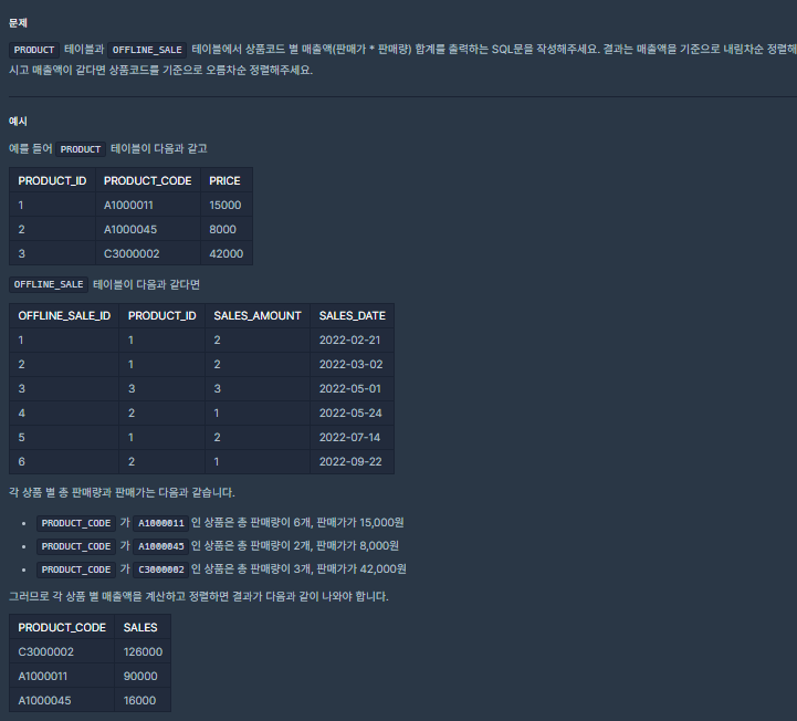 ==> PRODUCT 테이블은 상품들의 상품 정보를 담은 테이블 , 오프라인 상품 판매 정보를 담은 OFFLINE_SALE 테이블 ==> OFFLINE 테이블 기준으로 PRODUCT_ID를 바탕으로 조인해야한다.