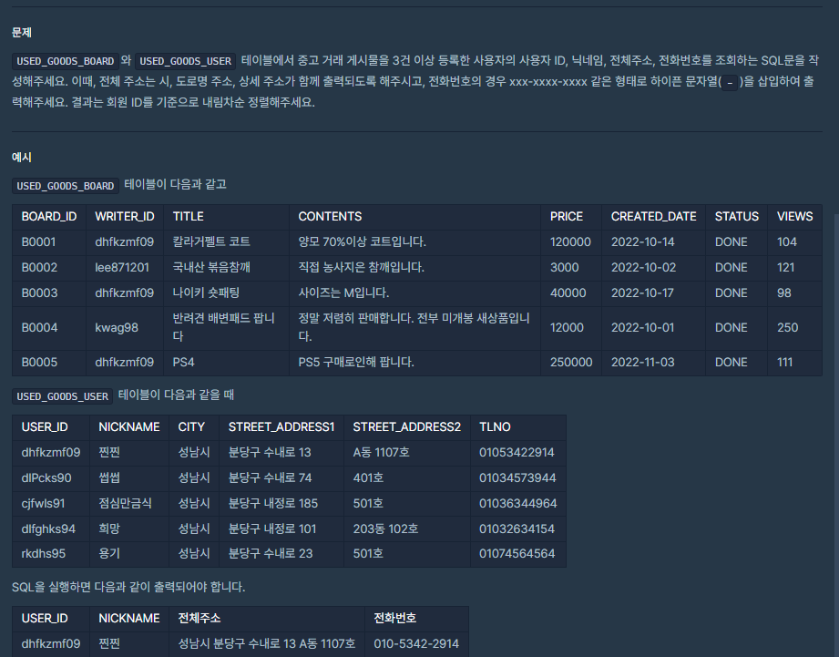 (SELECT USER_ID , NICKNAME , CITY ||' '|| STREET_ADDRESS1 || ' '|| STREET_ADDRESS2 AS ADDRESS, SUBSTR(TLNO,0,3)||'-'||SUBSTR(TLNO,4,4)||'-'||SUBSTR(TLNO,8,4) AS TLNO FROM USED_GOODS_USER) B