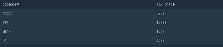 1. MAX()함수를 사용하여 CATEGORY 별로 MAX_PRICE를 추출했다